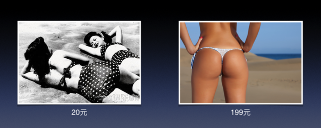 價格有什么變化?我年青時候左邊一大盤差未幾有一斤肉,在東北的菜館一定有一斤肉,差未幾要 8 塊錢,F(xiàn)在呢?36 塊錢。我想拿這個說明一下消費觀念的變化跟發(fā)展水平是息息相關的。 再看一下這個例子,我年青的時候假如去海灘上看看,婦女們穿的泳裝基本是這樣子,包住臀部的樣子比腦袋還要大。這些年我們?nèi)ズ┛吹降挠狙b已經(jīng)是這個樣子。價格發(fā)生了什么變化?左邊那么多布料用了 20 塊錢,右邊基本沒用布料,我們甚至懷疑那是不是布料,它還要 199 塊錢。所以良多時候就是這樣非常簡樸的道理,外國人不知道,由于那些發(fā)達國家沒有經(jīng)歷過這樣的時代,但是我們很清晰。